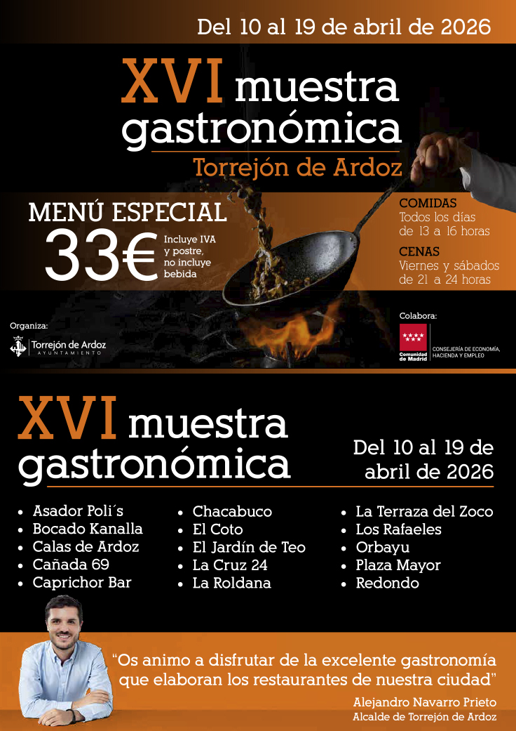 Desde hoy, viernes 10, al próximo domingo, 19 de abril, vuelve la Muestra Gastronómica de Torrejón de Ardoz que ofrecerá menús de alta cocina a 33 euros y que abarcará dos fines de semana. Se celebrará durante los horarios establecidos, que son de 13:00 a 16:00 horas para las comidas todos los días y de 21:00 a 12 de la noche para las cenas de los viernes y sábados.